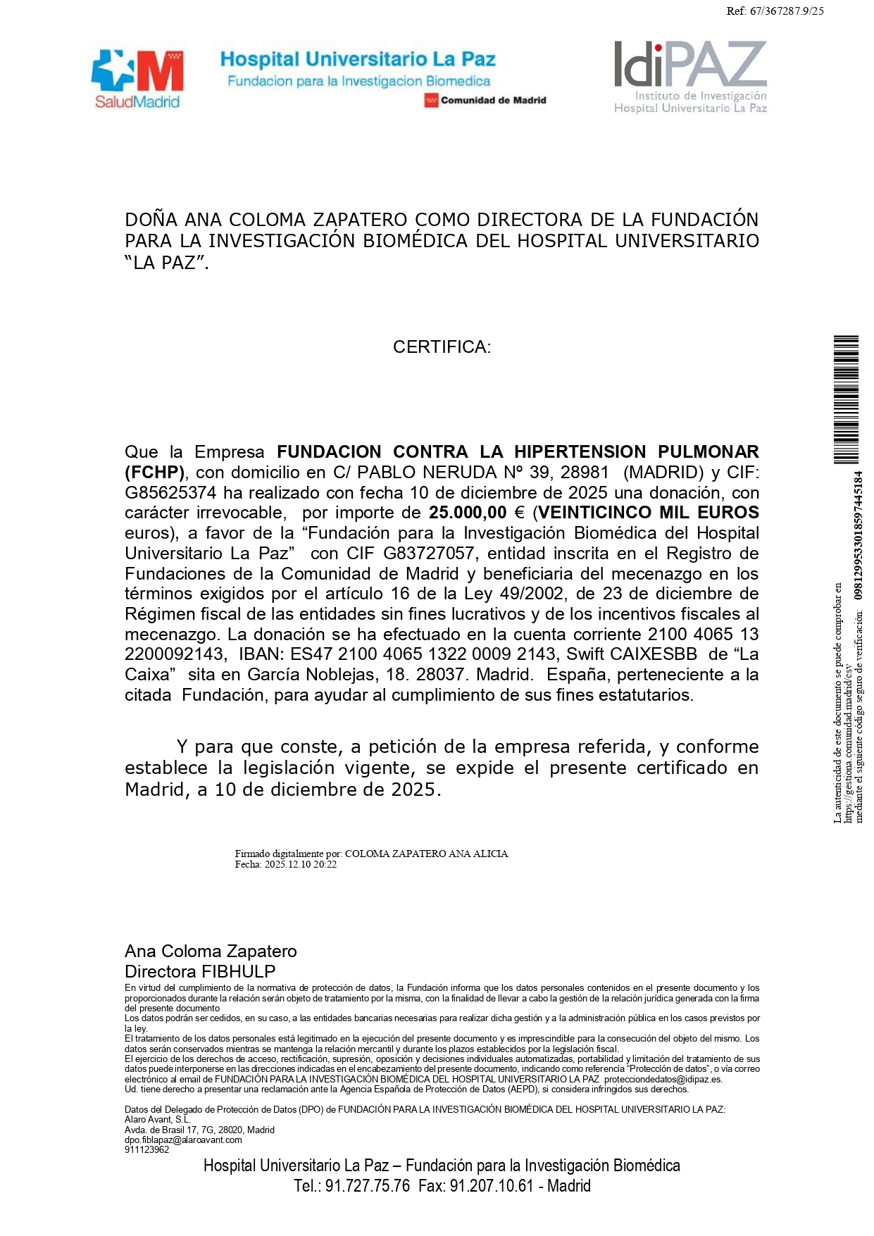 LA FUNDACIÓN PARA LA INVESTIGACIÓN BIOMÉDICA DEL HOSPITAL UNIVERSITARIO LA PAZ. Estos son los certificados que lo atestiguan.